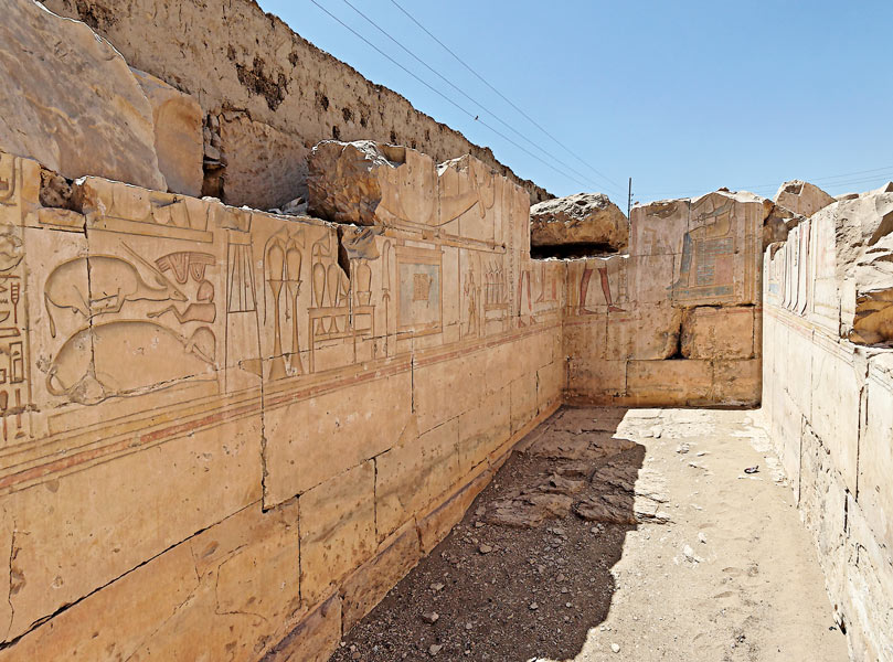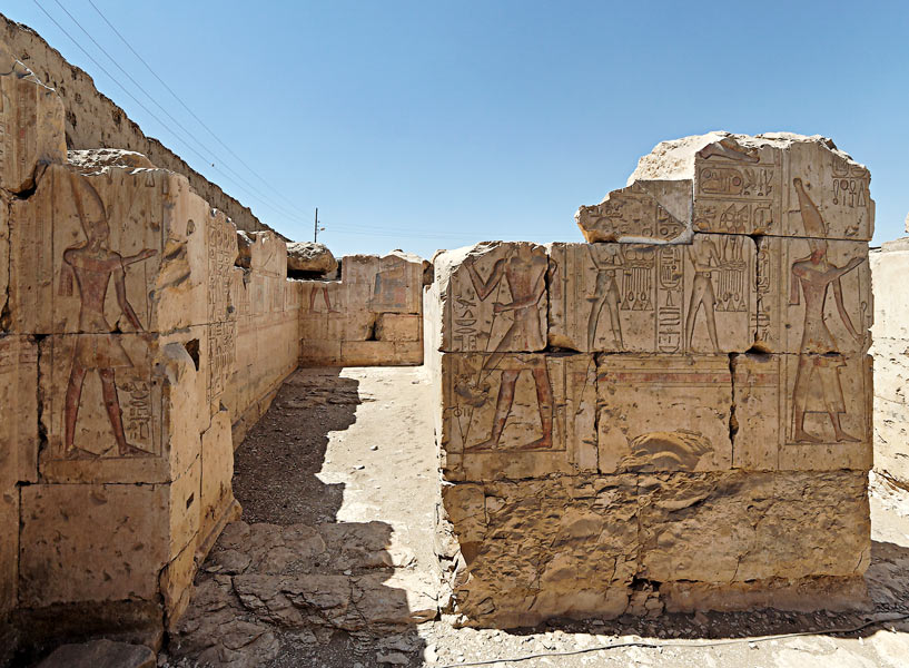Sur la partie sud du portique, se trouve la chapelle O dont on voit ici l'entrée. Elle est dédiée à Osiris (Mariette). De chaque côté de l'entrée, Ramsès nous invite à entrer. Sur le panneau de droite, deux dieux Hapy qui font partie de la liste des nomes qui se déroule sur le mur du portique. A droite, l'entrée de la chapelle N où se trouvait la liste des rois.