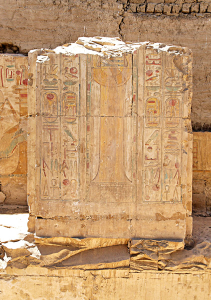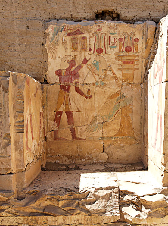 La chapelle S était une chapelle à niches comme la chapelle M. Ici une magnifique représentation de Ramsès et d'Osiris protégé par le pilier Djed muni d'ailes.