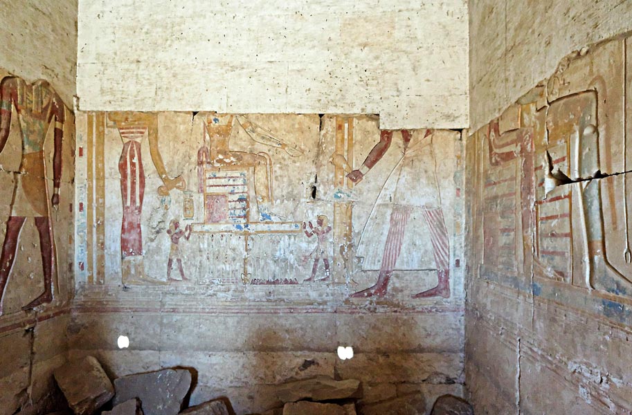 Chapelle L : dans la scène du fond , deux petits pharaons soutiennent le trône d'une déesse.