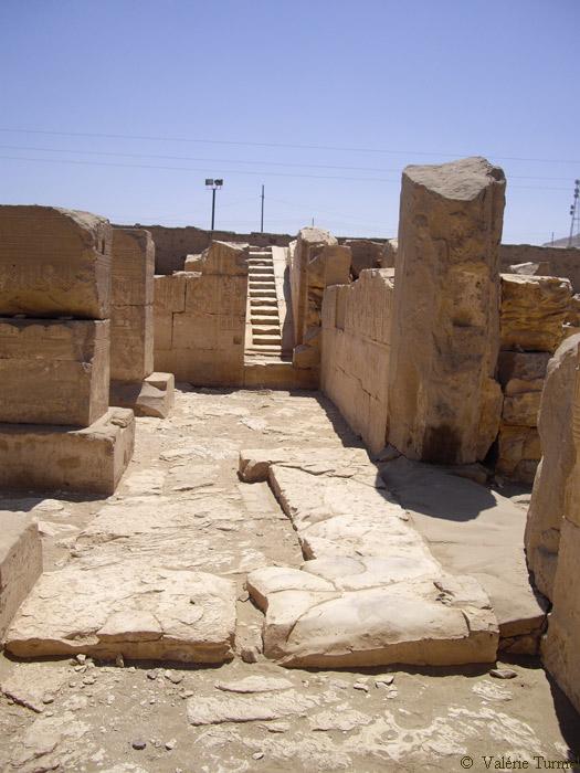 Dans le fond, l'escalier permettait aux prêtres de monter sur le toit. On voit que la série des villes se poursuit sur le mur à droite. |