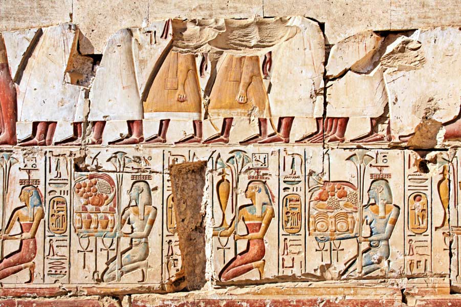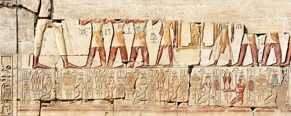 Sur le 3ème en partant de la droite, le nom de Thébes "Ouaset". Au-dessus, une procession.