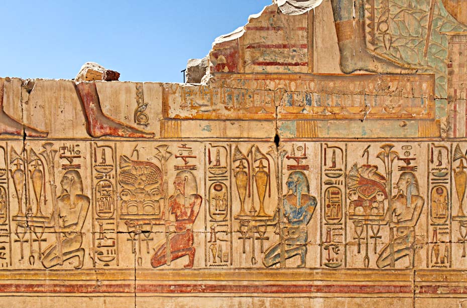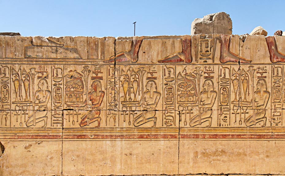 Mur Ouest : en dessous d'une scène superbe, mais malheureusement incompléte, où on reconnait les ramures d'un arbre Ished, une série de dieux Nil aux couleurs éclatantes portant des noms de ville comme sur les autres murs. A gauche, le nom de Nekhen.