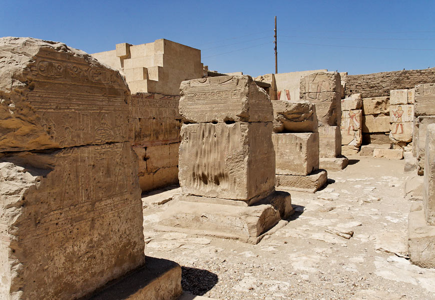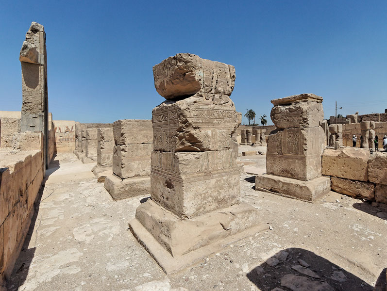 Dans cette autre vue du portique, vous pouvez apercevoir les mur ouest et sud, ainsi que leurs scènes détaillées sur d'autres pages. Le dernier pilier est un peu mieux préservé. Sur le deuxième en partant de la gauche, on peut remarquer les cupules crées par les officiants en touchant le pilier de leurs mains.