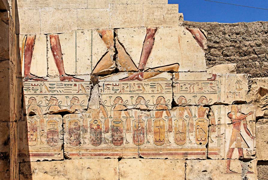 Les peuples ennemis soumis ou voisins , les Neuf Arcs, sont représentés ici par des captifs asiatiques, barbus : à l'extrême gauche, le Tehenou (la Lybie actuelle); ensuite Naharin, nom du Mitanni; en 4ème position, le Khatti, pays des Hittites; puis Kefetiou (la Crête actuelle) (Menu, 2003). La plupart de ces pays n'étaient pas assujettis à l' Égypte et étaient représentés "idéalement" comme des captifs.