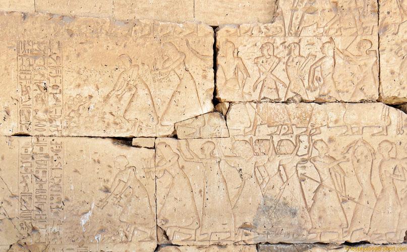 Après la bataille, les mains des ennemis morts sont comptées pour évaluer leurs pertes. Pendant que les soldats posent les mains coupées sur le tas, les scribes en font scrupuleusement le décompte. Derrière, on pousse les prisonniers. Vous pouvez cliquer sur la scène en haut à gauche pour avoir des détails.