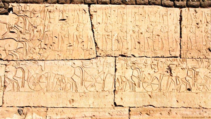 Arrivée des Néarins venant du pays d'Amurru : Le nom Néarin (ou na'arin) a pu faire croire à une origine sémitique pour ces troupes. D'après Obsomer, il s'agirait d'une armée égyptienne laissée dans le pays d'Amurru (en gros le Liban actuel) lors de la campagne de l'an 4. Elle se serait déplacée suite à des renseignements sur la position de l'armée hittite. Pour P. Grandet (2008), Ramsès II plaça cette troupe d'élite composée des meilleurs éléments en protection du camp dans la direction où, pensait-il, devait arriver l'attaque ennemie. D'après M. Sancho (2009), c'est plutôt l'hypothèse de Grandet qu'il faut privilégier, la présence d'une telle armée dans la pays d'Amurru aurait été remarquée par les Hittites. Quoiqu'il en soit, placée là de façon intentionnelle ou arrivée de son propre chef, cette troupe des Néarins ou Na'arins a sauvé Ramsès II de la défaite.