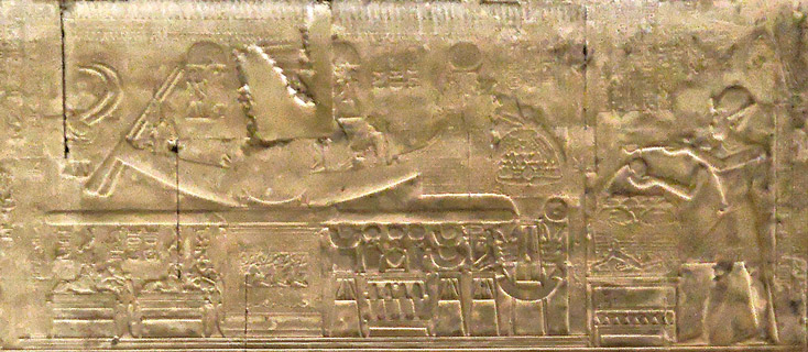 Scène 12 : Offrir l'encens. Le roi tient un encensoir et verse de l'eau devant une offrande de nourritures. Le rite est dirigée vers la statue qui se trouve dans le naos sur la barque sacrée. |