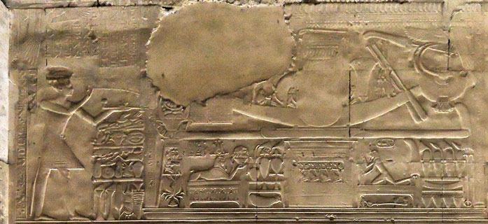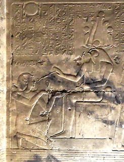 Scène 25 : Présenter les insignes du pouvoir. Le roi s'agenouille devant Rê-Horakhty et lui présente les insignes du pouvoir. |