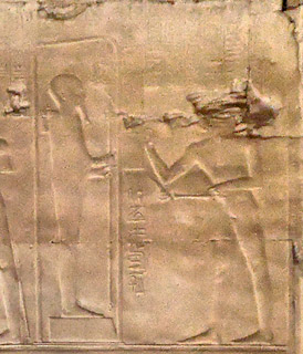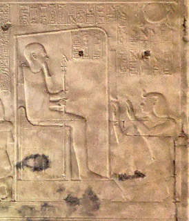 Scène 5 : Encenser l'uraeus. Le roi est agenouillé avec un encensoir devant le dieu pour le purifier. |