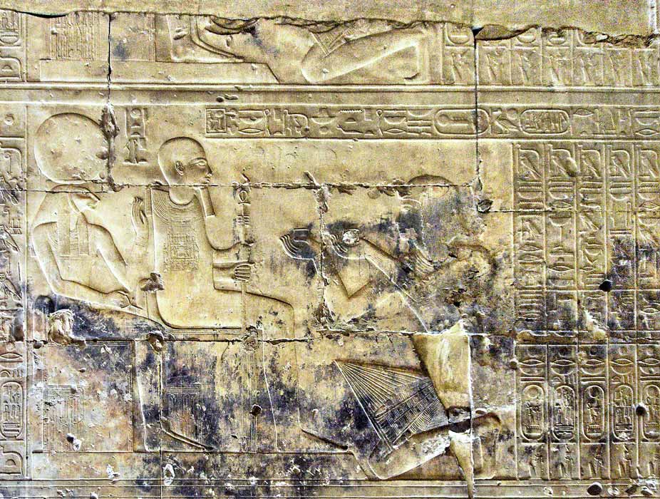 Dans ce montage, les scènes sont présentées dans le sens du roi. Dans la légende au-dessus de cette scène, il est possible de lire Sokar-Ptah ....Ptah-Sokar. Il s'agit sans doute des deux dieux associés dans une seule entité. Le dieu est représenté comme Ptah, avec son sceptre habituel et porte un collier et un superbe pectoral. Derrière Ptah, Sekhmet qui était considérée comme son épouse à Memphis. Leur fils est d'ailleurs Nefertoum. Devant eux, le pharaon leur présente des vases. Les scènes du haut de cette paroi sont détruites. |