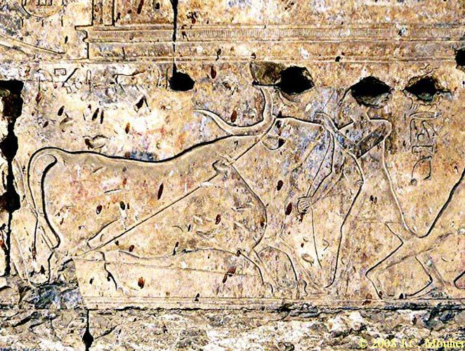 Ces scènes occupent le bas du mur. Ici deux hommes attachent le taureau.