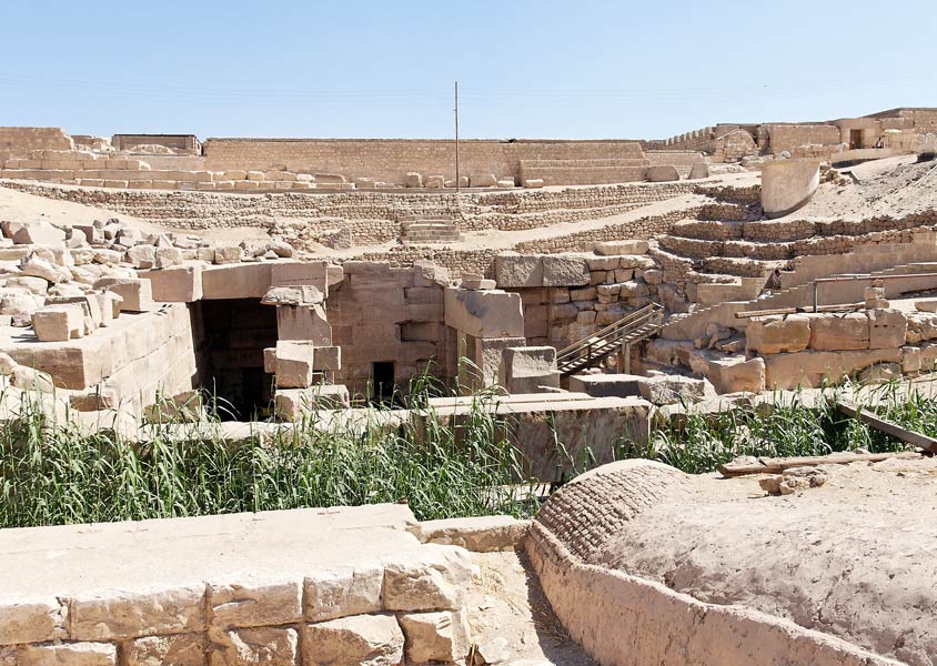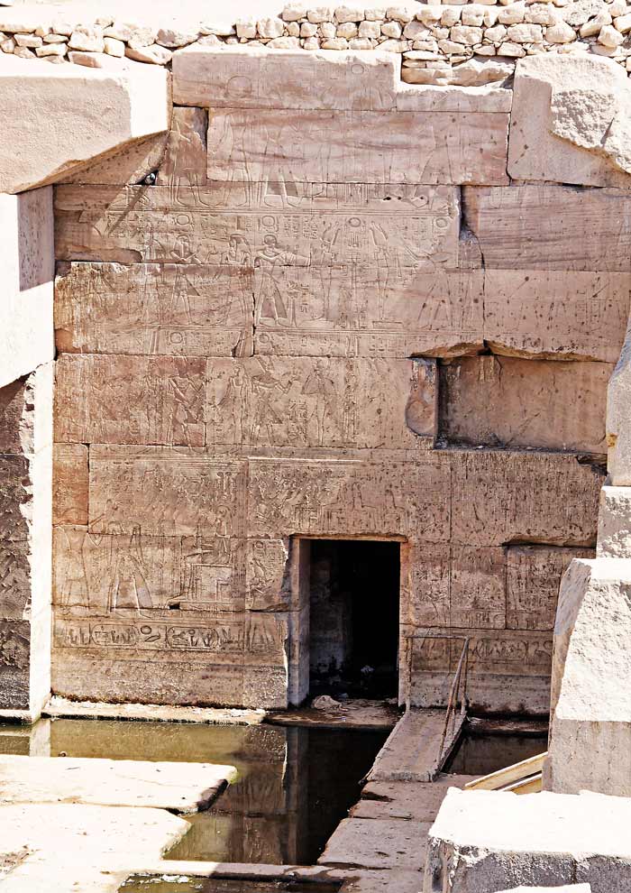 Le panneau est décoré de petites scènes, montrant le roi faisant des offrandes à différents dieux et déesses. De l'eau stagne sur le sol de l'Osiréion, remontée de la nappe phréatique.