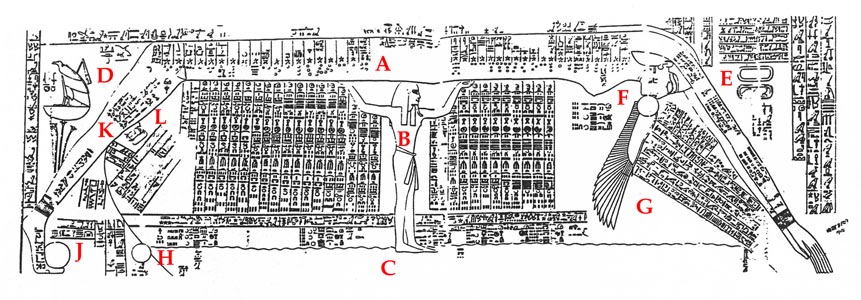 Le corps de Nout (A) s'étend d'est en ouest, soutenue par le dieu Chou (B). Le dieu Geb (la terre C) n'est pas représenté. Le soir, le soleil (F) est avalé par la déesse et le matin, il renaît : ici le soleil est juste en dessous de l'horizon (H). Le soleil monte à l'horizon depuis les pieds de la déesse (J), et apparaît dans toute sa puissance (K). Le soleil naissant est sous la forme d'un scarabée ailé (kheper) (L). C'est le monde visible dans lequel se meut le soleil. La déesse Nekhbet , protectrice du sud, est sur la gauche (D). Le texte G décrit le cours de l'astre.