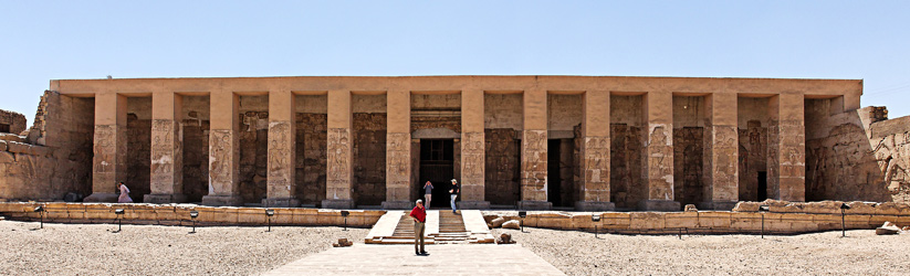 La partie gauche du mur du portique contient la Grande Inscription Dédicatoire de Ramsès II. Cette inscription est accompagnée d'une superbe scène où Ramsès II présente la Maât à Osiris, Isis et Séthy. La partie droite contient plusieurs scènes avec des dieux différents. Chaque pilier est décoré sur ses quatres faces..