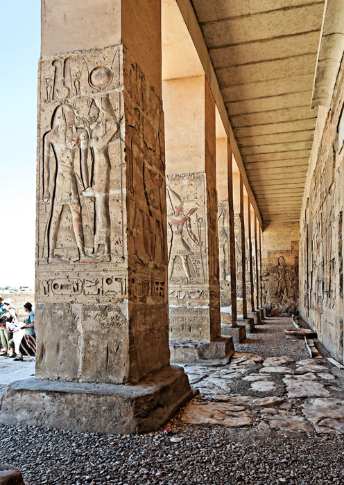 Vue générale du portique gauche. Sur le premier pylône, Isis coiffée d'une coiffure hathorique (ou Hathor) donne la vie au pharaon.