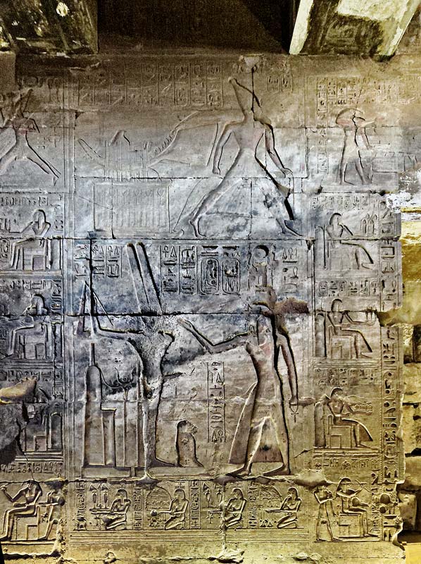 Sur la scène du haut, Ramsès tire la barque de Sokar. Le dieu l'assure de sa protection. En dessous, Ramsès II est devant le dieu Min, toujours représenté ithyphallique. Derrière le dieu, un édifice circulaire étiré vers le haut avec un mât et une corde enroulée est sans doute une image de son sanctuaire primitif. Devant lui, une forme non identifiée serait un dieu babouin. Les noms des nomes sur les dieux Hapy sont difficilement lisibles compte-tenu de l'état du panneau. (R. David, 1973, page 35). Vous pouvez cliquez sur les scènes principales pour les voir en vue rapprochée. A gauche, on retrouve les scènes que l'on retrouve habituellement sur chaque panneau. (cf le panneau avec Sechat ou la page sur la porte d'Horus pour une explication complète de ces petites scènes). A droite, les petites scènes autour de la porte de Sethy sont différentes, puisque, à la place de dieux représentés habituellement dans les petites scènes, c'est le roi qui présente des offrandes (R. David, 1973, page 35). Les scènes avec Thot et Sechat restent les mêmes. Vous pouvez utiliser la barre de navigation sous la photo pour les autres scènes du même mur ou retourner à la description des scènes. |