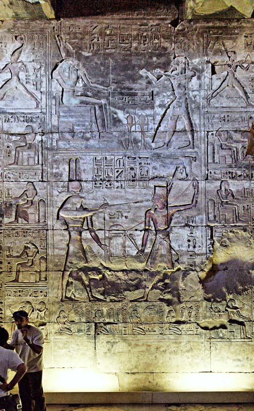 . Dans la scène centrale, le roi offre un temple, dans une petite chapelle, à Horus, fils d'Isis. La corde que tient le roi est en fait une tentative pour représenter le lancement par celui-ci de produit purificateur dans la tranchée autour du temple. En haut, le roi présente du vin à Horus comme un présent pour consacrer le temple. (R. David, 1973, page 37). (cf le panneau avec Sechat pour une explication complète des petites scènes autour du panneau centarl). Vous pouvez utiliser la barre de navigation sous la photo pour les autres scènes du même mur. |