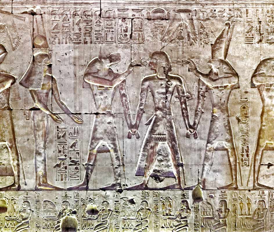 La scène fait partie de la montée royale vers le temple. Le roi est conduit par Oupouaout et Horus, en présence d'Hathor. Horus dit :"Entrez et vous verrez mon père Osiris". En dessous de la scène, les dieux Hapy portent sur leurs têtes les enseignes de 7 nomes de Haute-Égypte. A droite, le 13ème. (pour les identifications, voir notamment M. Dessoudeix, page 755 et suivantes). |