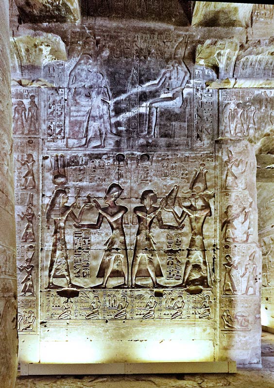 En haut, Isis nourrit le roi de son sein en présence d'Horus. En dessous, deux scènes : à gauche, Isis présente le collier menat, un sistre et l'uraeus au roi. A droite, le roi reçoit la double couronne des mains d'Horus. A droite, les petites scènes de la porte menant à la chapelle d'Horus et à gauche, les petites scènes de la porte d'Isis. (R. David, 1973, page 41) Vous pouvez cliquer sur les deux scènes principales pour les avoir en plan rapproché. Vous pouvez utiliser la barre de navigation sous la photo pour les autres scènes du même mur. [retour à la description des scènes] Les différentes sources d'éclairage (rampe du bas et lumière du jour) donnent cet aspect insolite à l'image.