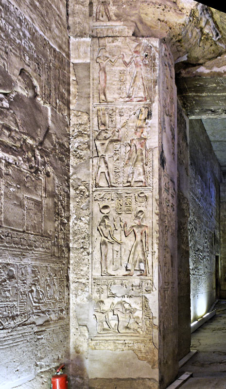 La porte de Sethy côté sud Sur le côté de la porte de Sethy, les dieux rendent hommage non pas à Sethy, mais à Ramsès II. Ce sont les dieux qui sont ici représentés face à la porte, et non pas le roi. En bas, Thot et Sechat . (R. David, 1973, page 38 et 39) Vous pouvez utiliser la barre de navigation sous la photo pour les autres scènes du même mur. [retour à la description des scènes]