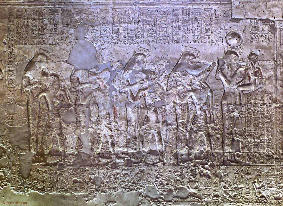 Le roi est nourri au sein de 4 différentes déesses Hathor.La première Hathor est dite 'Hathor de Denderah'. Le roi renaît à la vie, étant un roi nouveau . A droite, Isis materne le roi. La paroi est malheureusement très dégradée. (R. David, 1973, page 34) |
