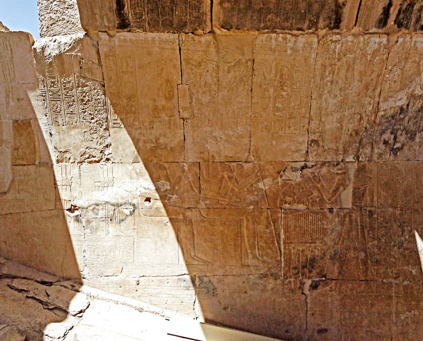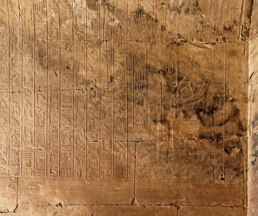 La déesse Sefekhet-abouy, autre nom de Sechat, est assise sur un trône. Elle s'adresse elle-aussi à Séthy 1er : "la maison est terminée, le monument est embelli...J'ai tendu la corde à l'intérieur des murs..les colonnes sont bien fixées..Combien divin est ce temple.." (voir le discours en entier dans R. David). La déesse invoque tous les dieux qui ont participé à la conception et à la réalisation du temple : Sokar, Ptah, Khnoum, Tatenen, Atoum, Nout, Neith et Selkit. Ainsi le temple est le résultat des actions divines, ce qui garantit sa pureté et sa sacralité (R. David). Elle cite également tous les dieux résidants dans le temple. Cette inscription aurait été gravée sous Séthy 1er.