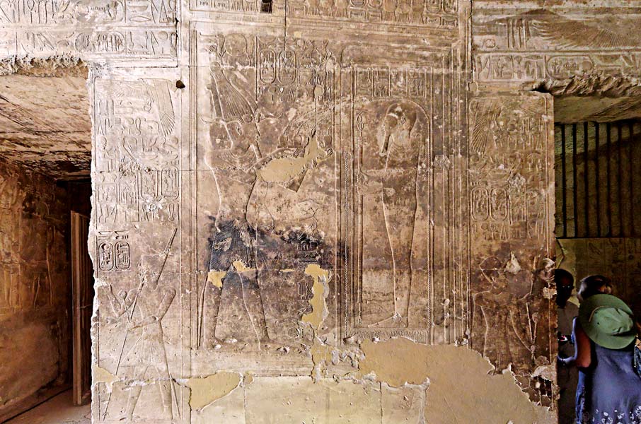 La Galerie des Annales s'ouvre dans la deuxième salle hypostyle et conduit vers d'autres salles de service connue comme le hall des Bouchers, le hall des barques et le Hall du Taureau qui mène à la sortie dont on voit la porte sur cette vue à gauche. Le roi Sethy 1er sanctifie cette porte avec sa titulature au-dessus de lui. Ci-dessous, le panneau à gauche de cette scène entre deux portes menant à d'autres salles.