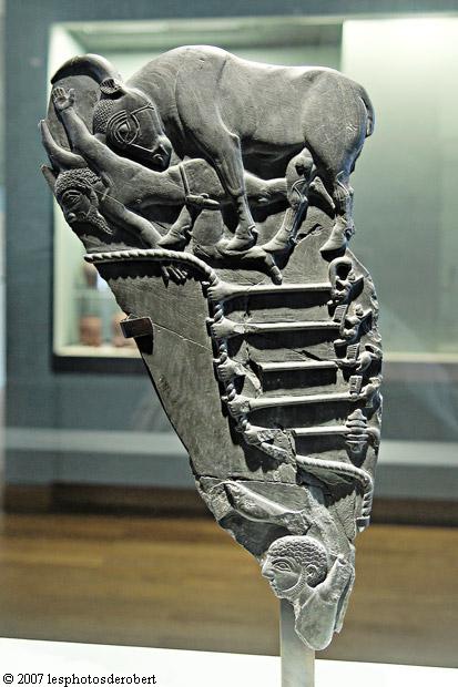 king represented in bull is running over his adversaries. The standards hold the cord with a hand. Under, one can see an enemy's head (curly