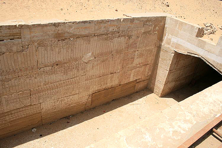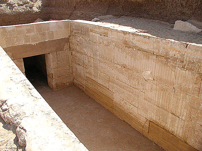 The west wall of this hall is decorated with chapters of the Book of the Dead dealing with the names of Osiris (chapter 141 to 143) (Murray, 1904). These chapters are inscribed within three registers. The register of the top gives a list of the divinities. The two registers of the bottom concern Osiris, his different epithets and his identifications: Khentiamentiu, Ounennefer, Orion... On the right, Merenptah is represented before a table of offerings (visible very partially here, to see below). On the left, a scene shows Horus invigorating Osiris.