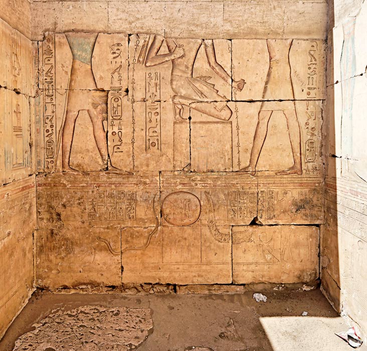 Two gods purify the King Ramesses kneeling on a pedestal. Ankh signs represent the purifying stream. Below, the beginning of the Litany of the Sun.