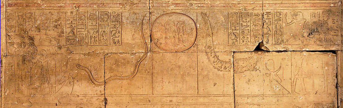 of the Sun appears at the time of the dynasty 17th This work bears as title "Book to pray Re in the west, to pray the united at the west." The text starts with a big litany that evokes 75 times the sun god under different names. These names are divided for example in two parts, even and odd numbers appearing in two different places, on the partitions right and left of a tomb. In the tomb of Sety 1st, the Litany is preceded by a title figure that you can see, as it is in this G chapel. It reunites the scarab and the god with head of ram, in a disk that makes escape the bad strengths, snake or alligator of which one can see the tails on the photo. (according to E. Hornung, cf. biblio). In another interpretation, the snake and the alligator are there to protect the disk.(Corteggiani, 2007). Nearby the two snakes, two antelope heads.