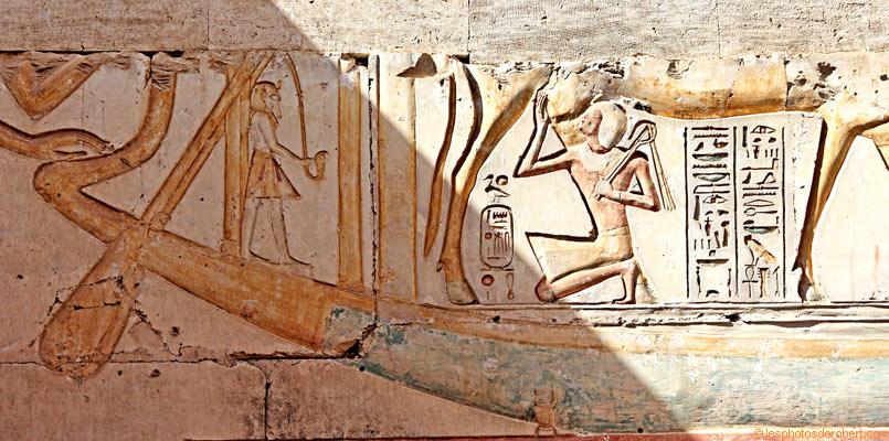At the front of the barque, on a stand, a sphinx covered by the disk and two Osiris feathers crushes a