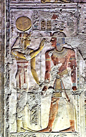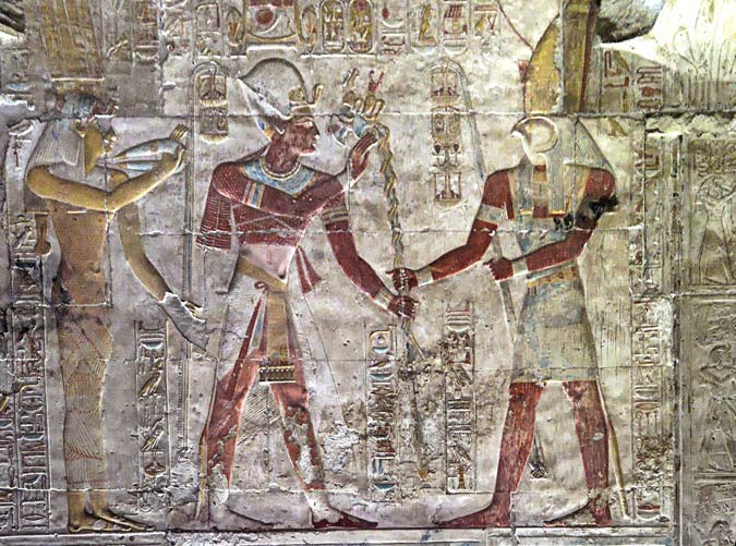 Lower Egypt. Horus holds out to him the symbol of the jubilees. Isis hold out to him