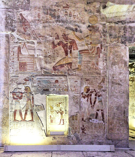 In the top, Isis (placed of the side of her chapel) holds the ring khepresh on the Pharaoh's head. This one censes Osiris. Isis carries the hairdressing hathorique. Click here to see the scenes in bigger.