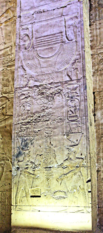is merely decorative. Below, two figures of king Sety hold a Djed pillar. Above, a beautiful necklace Menat and two uraeus. The top of the pillar with Oudjat