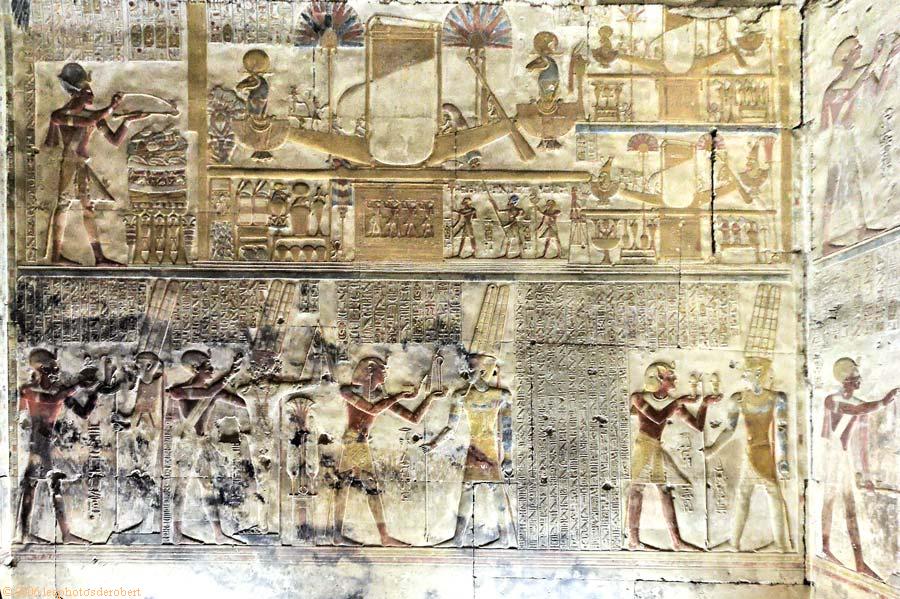 This panel is one of the most famous of this temple. Unfortunately, it is deteriorating in the bottom. Bottom scene : As on the other panels, one can see three different representations of Amun with the Pharaoh's classic offerings. Top scene: : Pharaoh throws the incense and presents offerings in front of the boat of Amun. With the right hand, he throws incense pieces. To the middle, the boat consecrated to the Amun god under which the Pharaoh is represented again. On the right, the boats consecrated to Mut (below), goddess wife of Amun and their son Khonsu. You can see the picture of the boat better while clicking on the top scene |