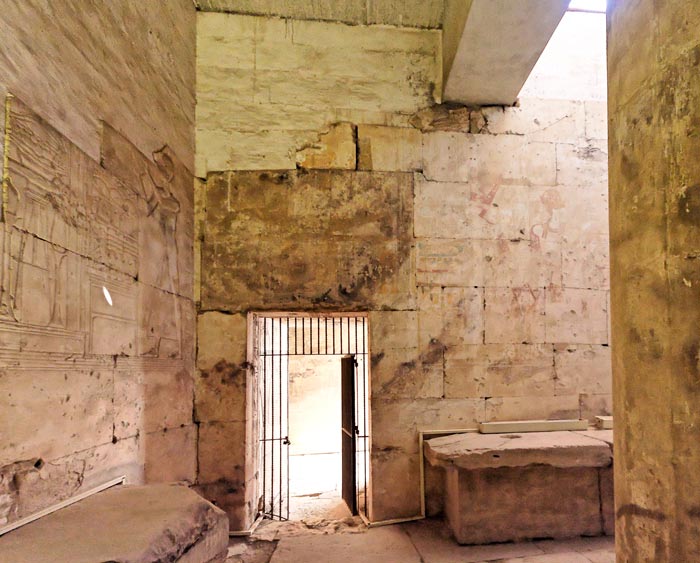 Entrance of the bark hall : you can see that a part of the wall is painted and a part of the north wall etched. The decoration is damaged. This scene is the complement of the scene showing the entry