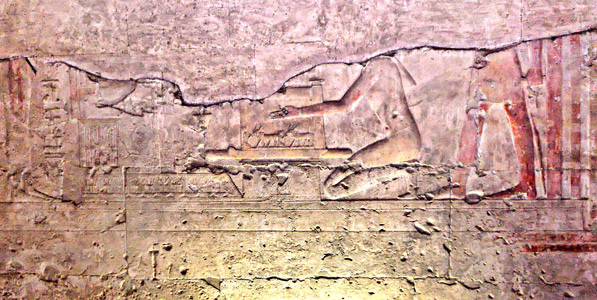 Wets wall of the B chapel : lying Osiris scene, that is also duplicated in the chapel of Sokar. Nephtys is knelt besides the bed of Osiris. According to R. David, this scene would correspond to the