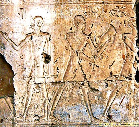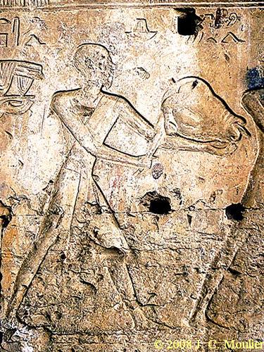 man carries away the head. On the right, a priest (hem neter) watches the butchers. Behind him, men in procession carry away the cuts of meat toward the temple.