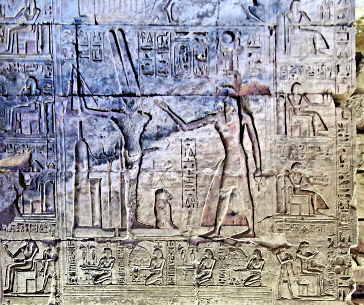 ithyphallic. Behind the god, a circular building stretched upwards with a mast and a wrapped cord is probably a picture of his primitive sanctuary. Before him, a non identified shape would be a god baboon. The names of the nomes on the Hapy gods are with difficulty legible due to the state of the panel. Below, on the right, Seshat writes the