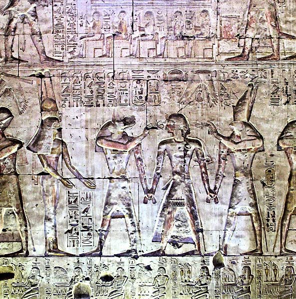 The scene is part of the royal induction toward the temple. The king is driven by Wepwawet and Horus, in presence of Hathor. Horus says: "Enter and you will see my father Osiris" [back to first hypostyle]