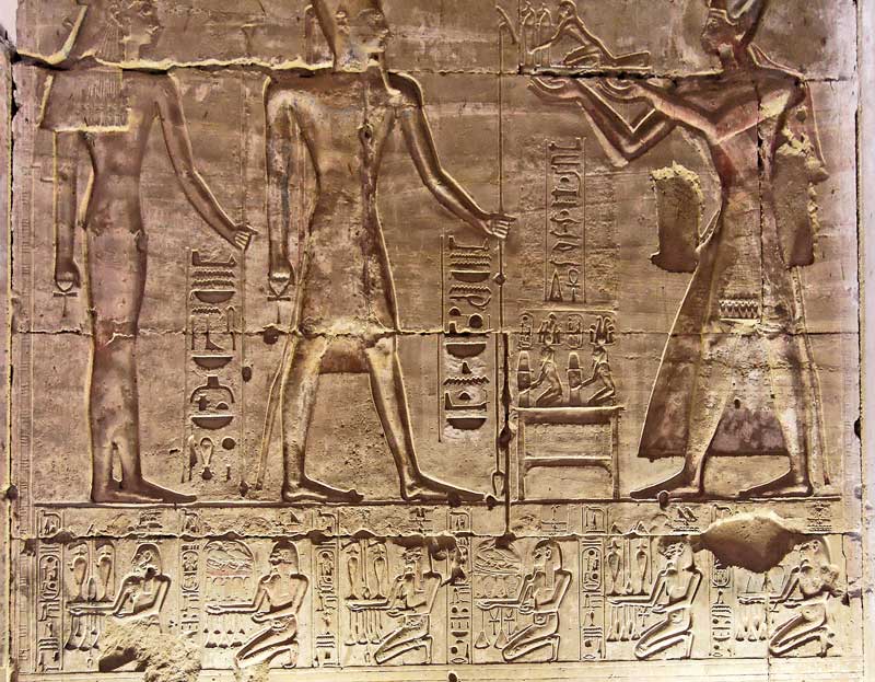 Ramesses offers himself to the gods, Amun-Re and Mut: on the platter, he is lying down, presenting two containers with animal heads. Before the standing king, two small kings also make each an offering. Below, on the Hapy gods, the first 5 nomes of Upper Egypt : one recognizes the one of Thebes Ouaset that carries the Ouas scepter . The last on the right is legible with difficulty (the 6th?). [back to first hypostyle] |