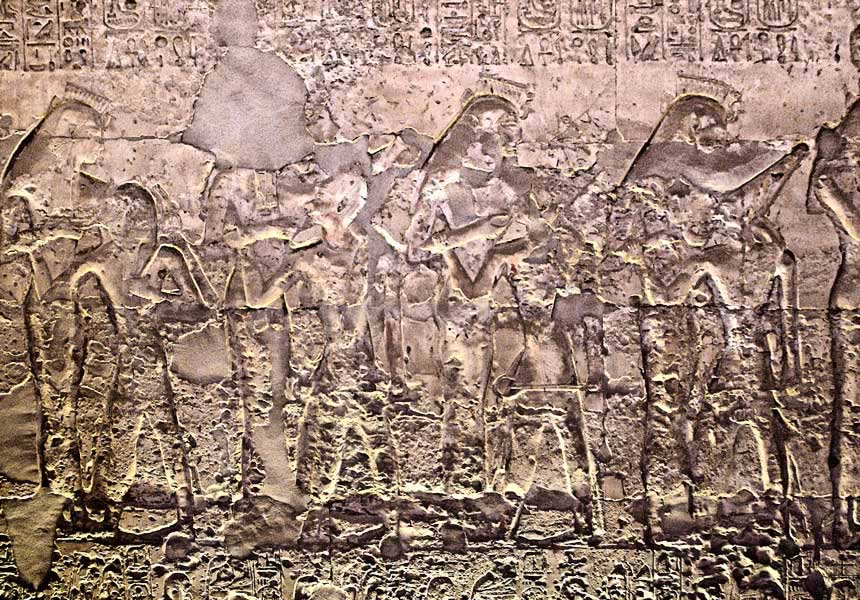 The king is suckled by 4 different Hathor goddesses. He is born again to life. [back to first hypostyle]