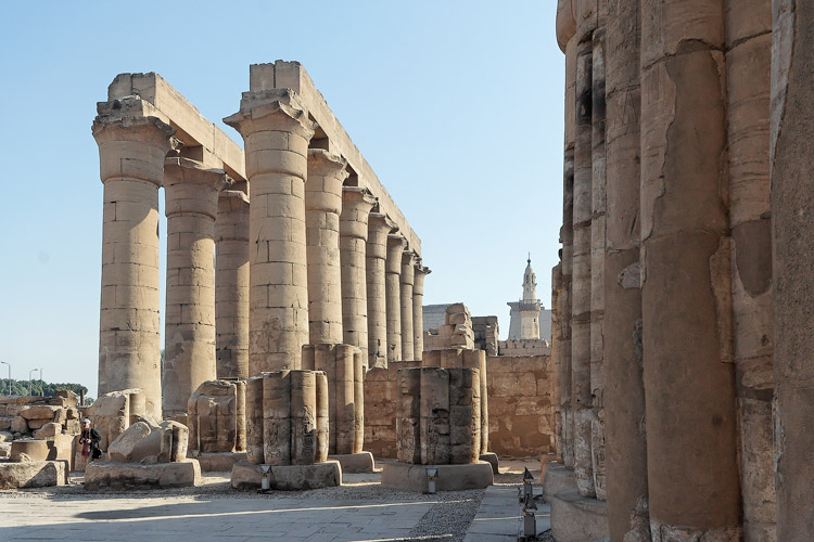 Cette grande colonnade est vue ici de l'intérieur du temple, en direction du pylône. Sur les murs tout autour, sont représentées différentes phases de la Fête de l'Opet, détaillées dans des pages suivantes. A l'entrée de la colonnade, se trouvent deux groupes de statues que vous pouvez voir en cliquant sur le lien ci-dessous.