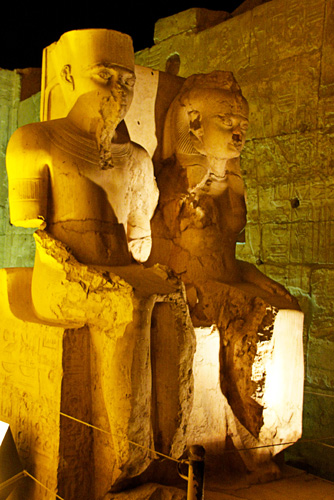 Les statues de gauche en entrant : à droite Ramsès II et à gauche , Amon et Mout. |