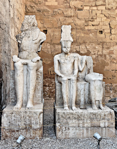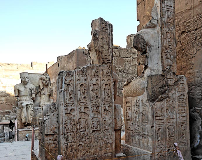 | Les deux groupes de statues se font face. D'après Porter et Moss, elles représentent Amon et Mout, et ont été marquées au nom de Ramsès II. A droite sur la photo, une statue de Ramsès II dont la tête manque (voir ci-dessous). |
