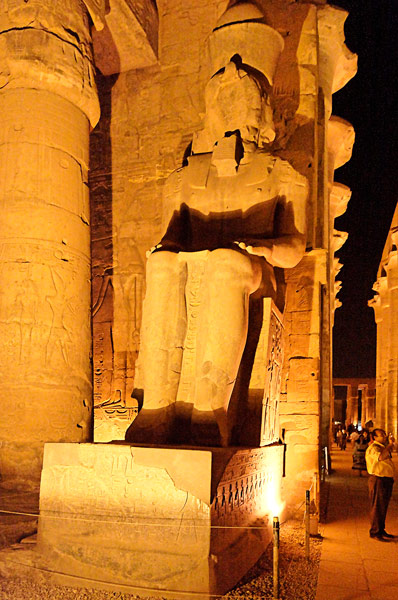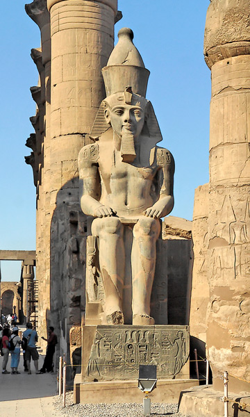 Deux statues colossales de Ramsès II encadrent le passage vers la grande colonnade construite par Aménophis III. Elles comportent sur le côté des scènes de Sema-Touy et de captifs. A côté du pharaon, la reine Néfertari est représentée sous forme d'une statuette le long de la jambe du pharaon. Sur le socle, deux prêtres Iounmoutef encadrent une inscription.