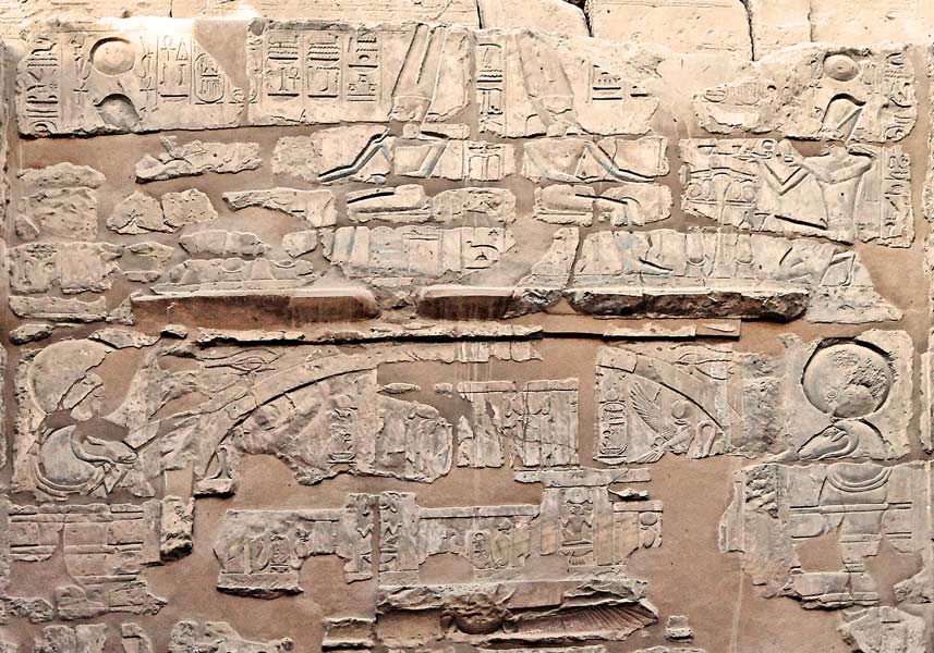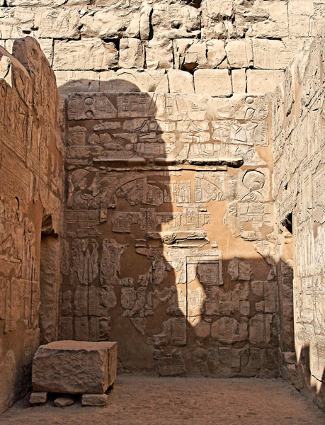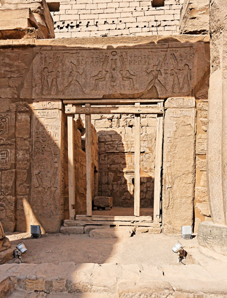 Au-dessus de l'entrée de la chapelle d'Amon du reposoir, le linteau comporte 2 doubles scènes dans lesquelles le roi est dans les bras d'Amon et court vers lui avec des vases.