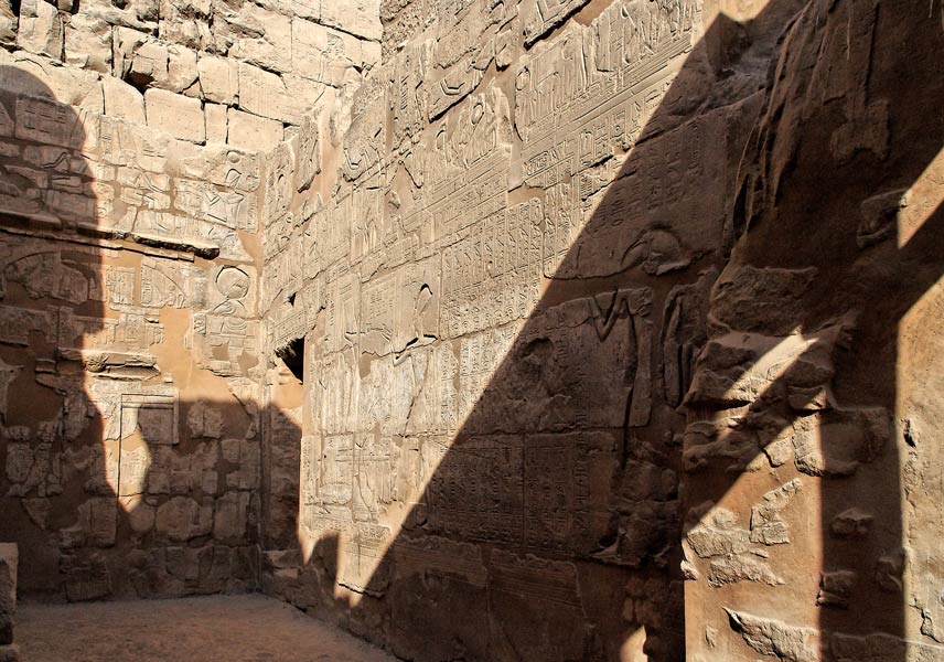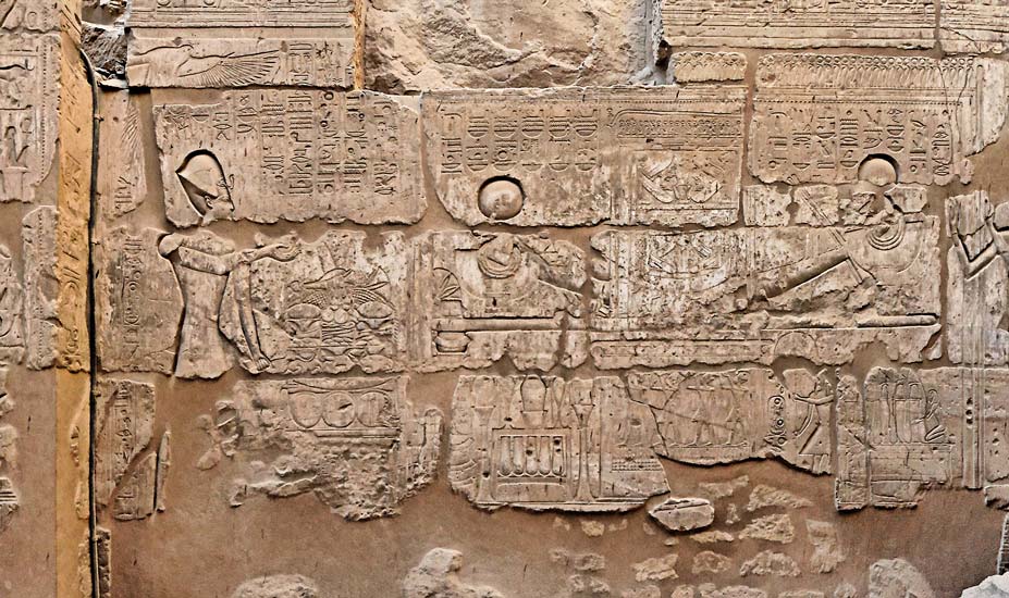 | Scène du mur est : le roi encense des offrandes à une statue d'Amon. A droite, le dieu Thot et entre lui et le roi, une liste de divinités. |