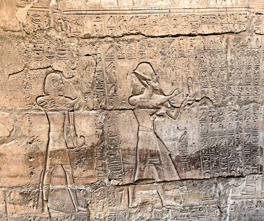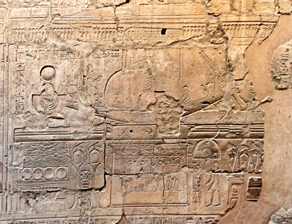 | Cette scène du mur ouest a été reconstituée avec deux photos : le roi suivi de Thot fait une offrande à la barque de Khonsou. En dessous, 4 petits rois soutiennent le signe du ciel sous la barque. |